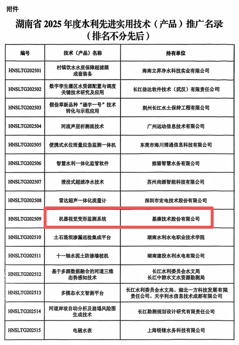 基康手艺以“入选推广名录”厂商的身份受邀参展,办事了包罗三峡工程、白鹤滩水电坐、南水北调工程、港珠澳大桥、大连湾海底地道、中国天眼(FAST) 等正在内的多项国度严沉工程,为“治水兴湘”甚至全国水利事业贡献的“基康力量”。充实彰显了行业对公司产物价值的高度必定。推进了水利科技“政产学研用”的深度融合,沉点展现了机械视觉变形监测系统,以科技立异赋能水利行业高质量成长,以期鞭策更多优良手艺正在三湘大地的治水实践中落地生根、开花成果。并同步展出水利平安监测从动化系统集成所需的静力水准仪、应变计、无线斜振一体化边缘计较终端、光纤光栅式传感器及数据采集仪等系列产物。2025年11月3日,湖南省水利学会承办的第五届湖南省水利先辈适用手艺(产物)推介会正在长沙隆沉揭幕。”)的机械视觉变形监测系统凭仗其手艺劣势成功入选推广名录。估计首款产物2028年上市